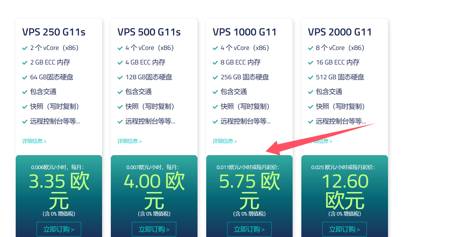 这张图片展示了四种不同的VPS套餐及其价格,从VPS 250 G11s到VPS 2000 G11,价格从3.35元到12.60元不等。 (由 AI 生成标题)