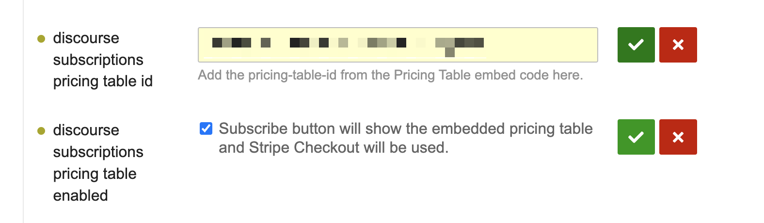 | discourse subscriptions pricing table id | 来自嵌入代码的 Stripe 定价表 ID。 |