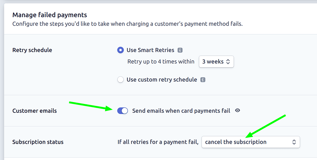 请注意,如果您未正确配置Stripe Webhook,并且由于任何原因(信用卡过期等)导致定期付款处理失败,用户仍然可以访问该组。要让Stripe自动取消订阅,请务必将您的管理失败付款设置配置为类似于下图,并按照上述说明配置Webhook。