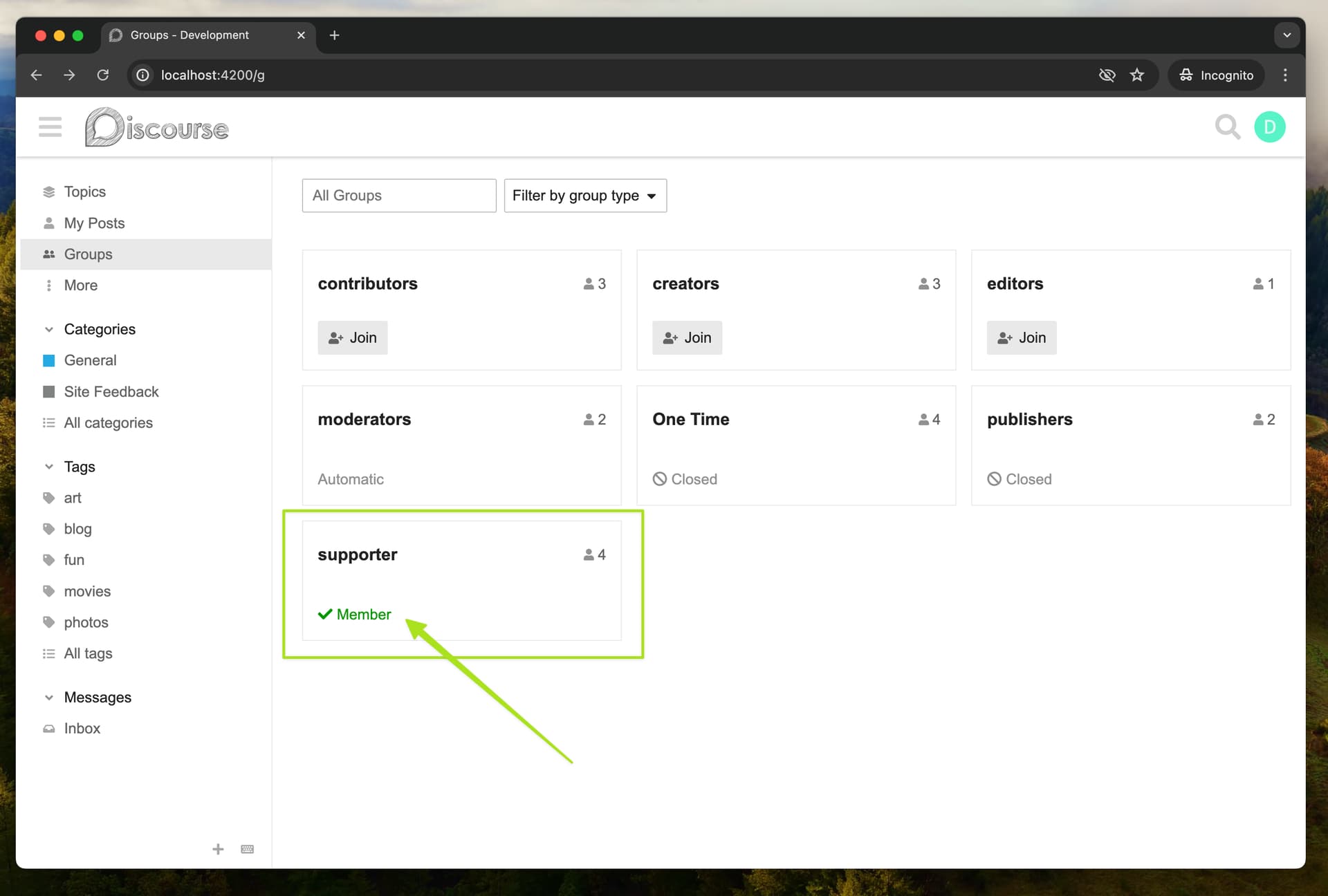 当用户成功订阅您的Discourse应用程序,并且信用卡交易处理完毕后,他们将被添加到用户组中。通过将用户分配到用户组,您可以管理用户在您网站上的访问权限。用户组是Discourse的核心功能,此插件除了将用户添加到您与计划关联的组以及从中删除用户之外,不做任何其他操作。
