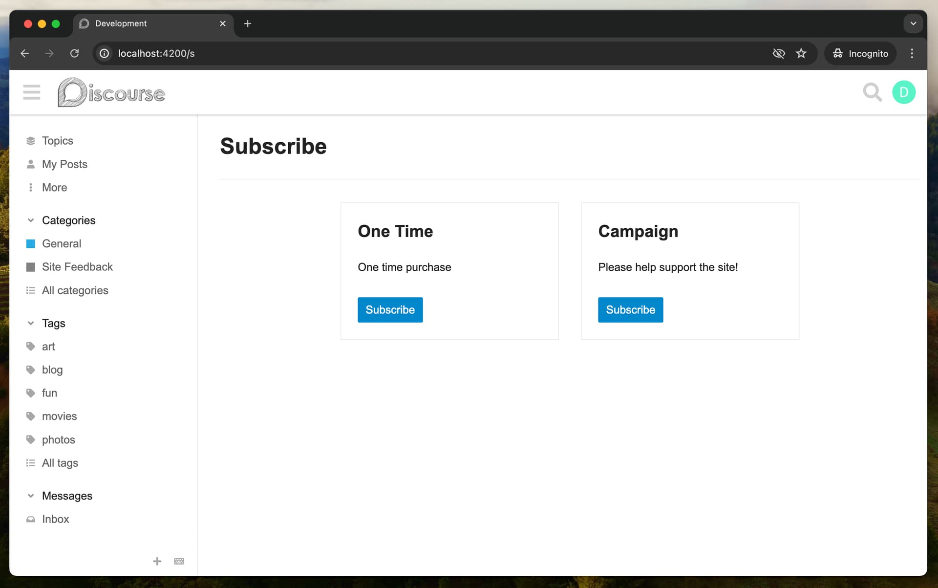 | discourse subscriptions campaign product | 当支持者点击活动上的按钮时,要发送给他们的 Stripe 产品 ID。如果此设置为空,支持者将被定向到主产品页面。 |