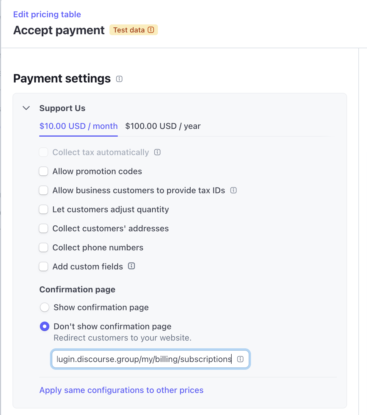 pricing-table-id添加到discourse_subscriptions_pricing_table_id站点设置中,同时启用该功能。在Stripe内设置价格表时,建议在结账完成后将用户链接回您的网站,否则他们将停留在Stripe确认页面,而没有返回您网站的链接。