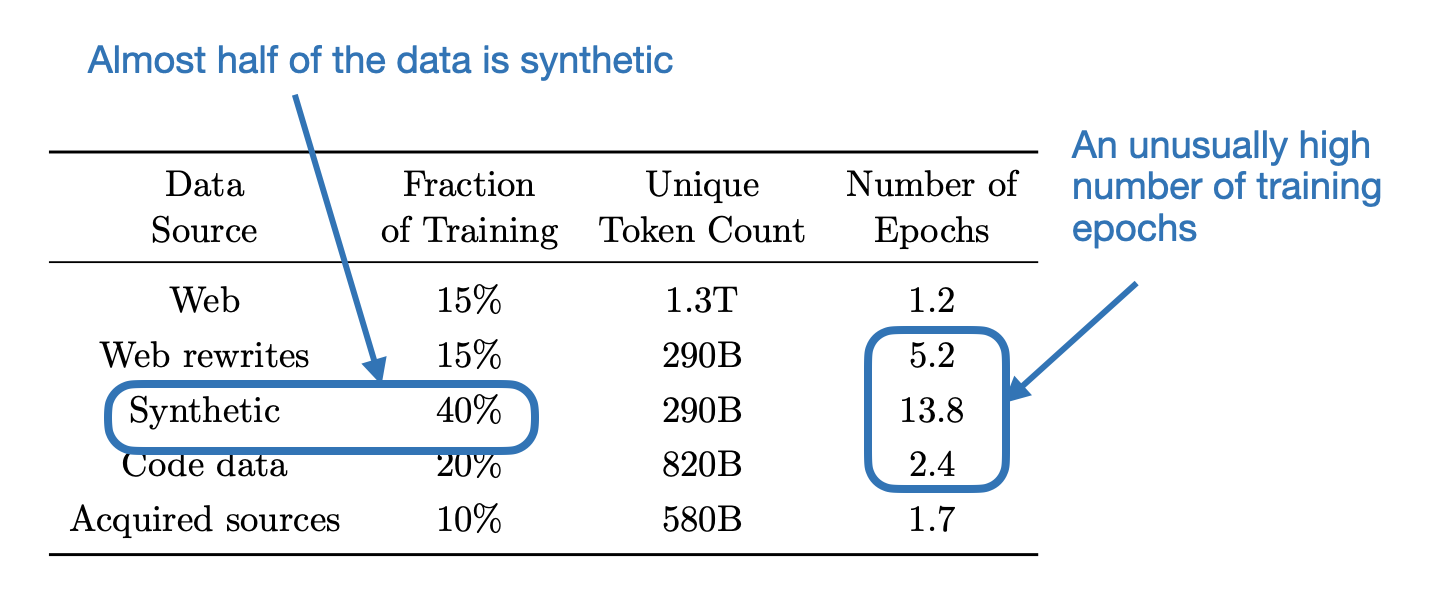 用于训练 phi-4 的数据集组合(来自 phi-4 论文的带注释的表格,https://arxiv.org/abs/2412.08905)。