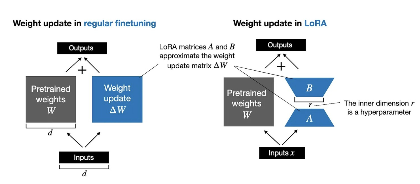 下图并排说明了完全微调和 LoRA 微调的这些公式。