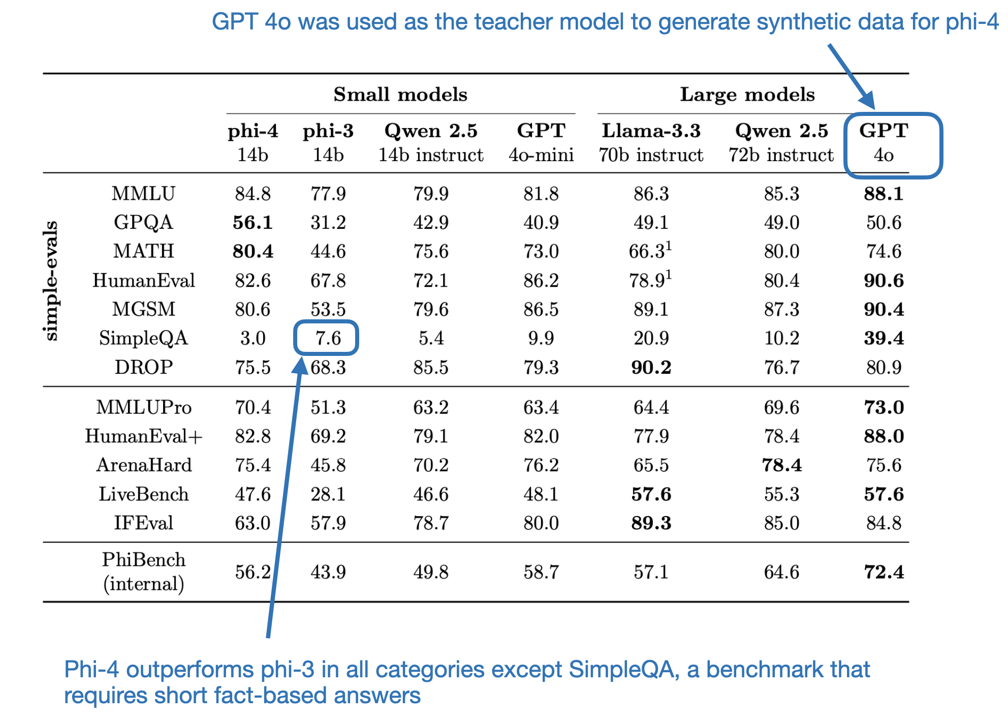 phi-4 与类似大小和不同大小的其他模型的性能比较(来自 phi-4 论文的带注释的表格,https://arxiv.org/abs/2412.08905)