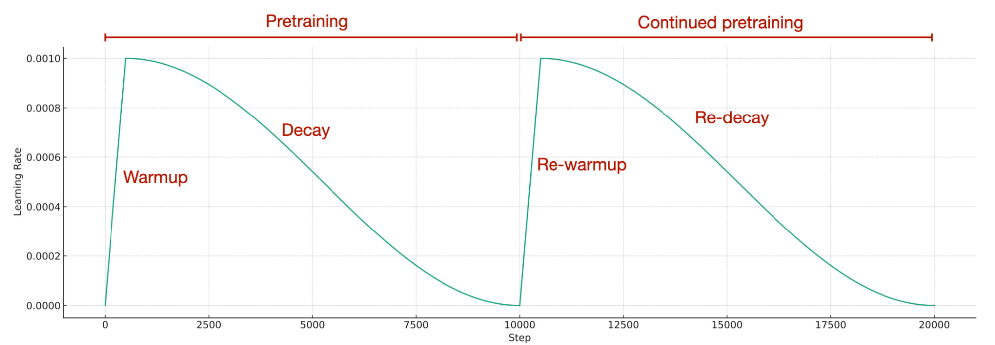 关于第 1 点,重新预热和重新衰减,更具体地说,这意味着我们采用与 LLM 初始预训练阶段使用的完全相同的学习率计划。