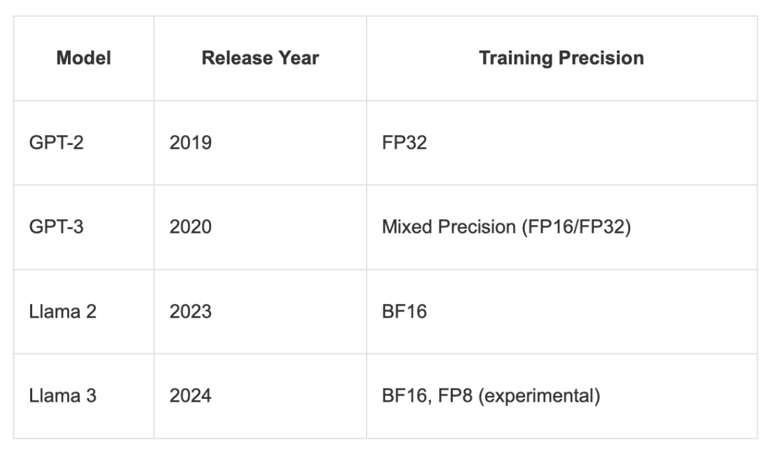 据我所知,以下是用于训练 GPT 2 和 3 以及 Llama 2 和 3 模型以进行比较的精度格式: