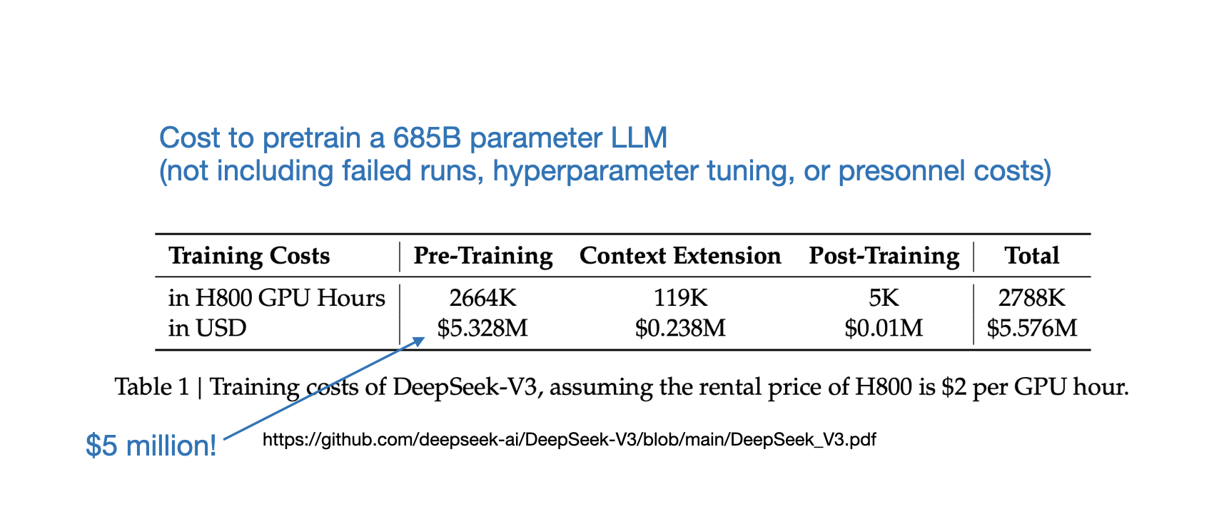 预训练和使用 LLM 相对昂贵。因此,我预计在可预见的未来,我们将看到更多巧妙的技巧来提高 LLM 的计算效率。作为参考,假设 GPU 租赁标价(这还不包括超参数调整、失败的运行和人员成本),训练最近的 DeepSeek-v3 模型将花费 500 万美元。