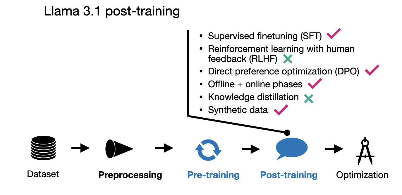 一个有趣的例子是 Meta AI 的 Llama 模型。虽然 Llama 2 是用 RLHF-PPO 训练的,但较新的 Llama 3 模型使用了 DPO。