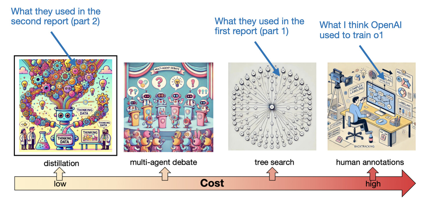 在这里,他们使用了一种蒸馏方法,这意味着他们使用精心的提示从 o1 中提取思考过程来训练模型以达到相同的性能。由于这是一篇很长的文章,我不会详细介绍,但我想分享该论文中一张有趣的图表,该图表总结了收集长思考数据的成本权衡。