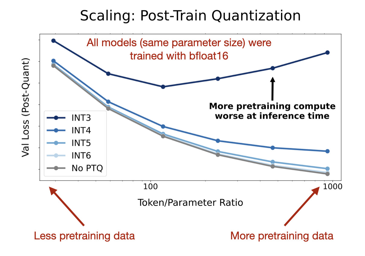 下图很好地说明了,更多的预训练数据并不总是更好,如果模型在训练后以非常小的精度(int3)进行量化,实际上可能有害,我发现这非常有趣。