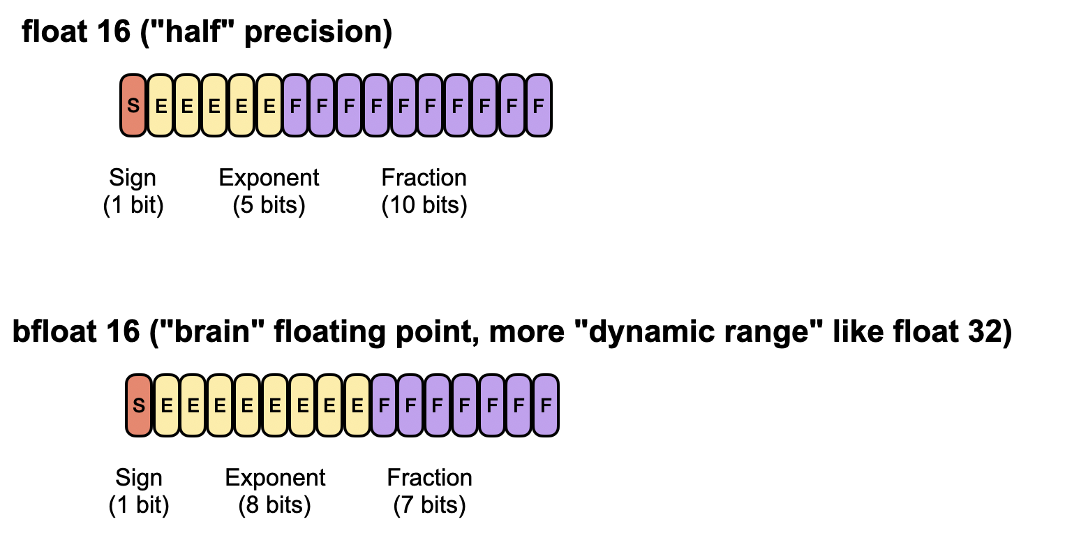 常规 16 位浮点精度和流行的 16 位脑浮点精度之间的比较