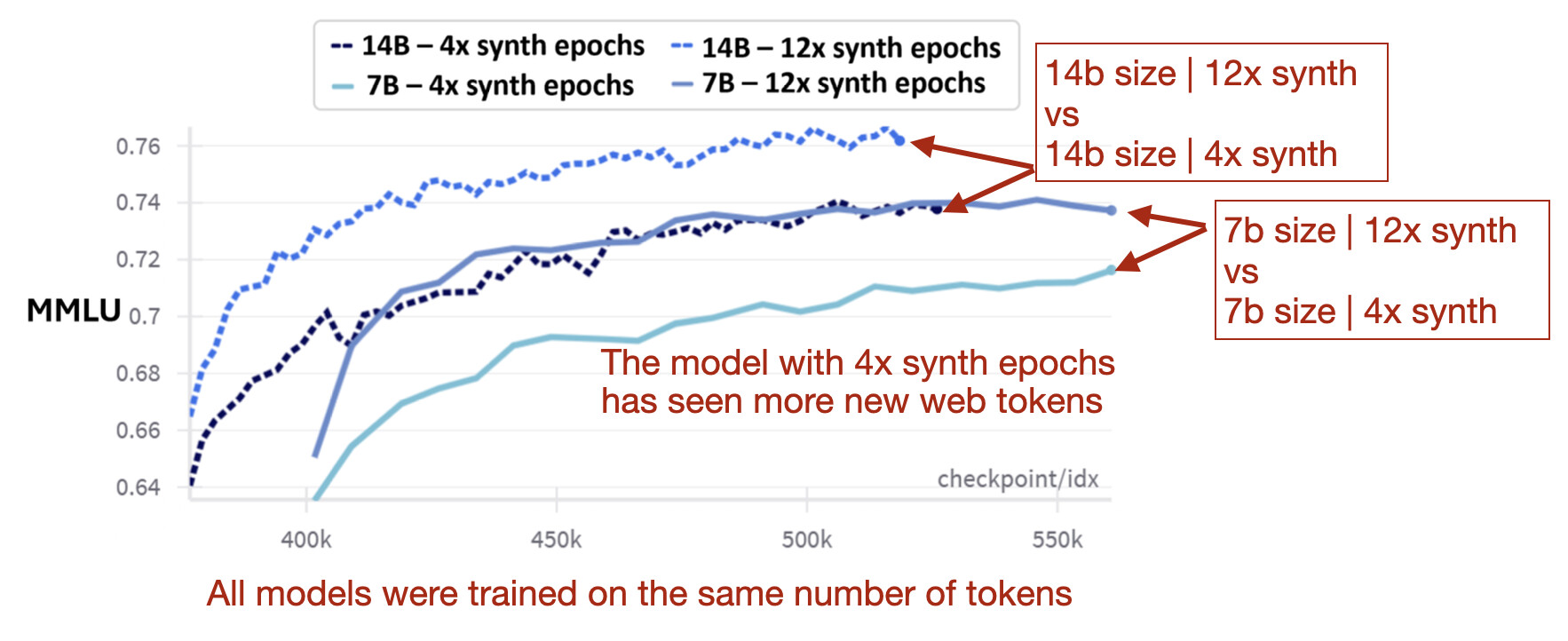 不同合成/网络数据集比率的模型性能比较。(来自 phi-4 论文的带注释的图表,https://arxiv.org/abs/2412.08905)。