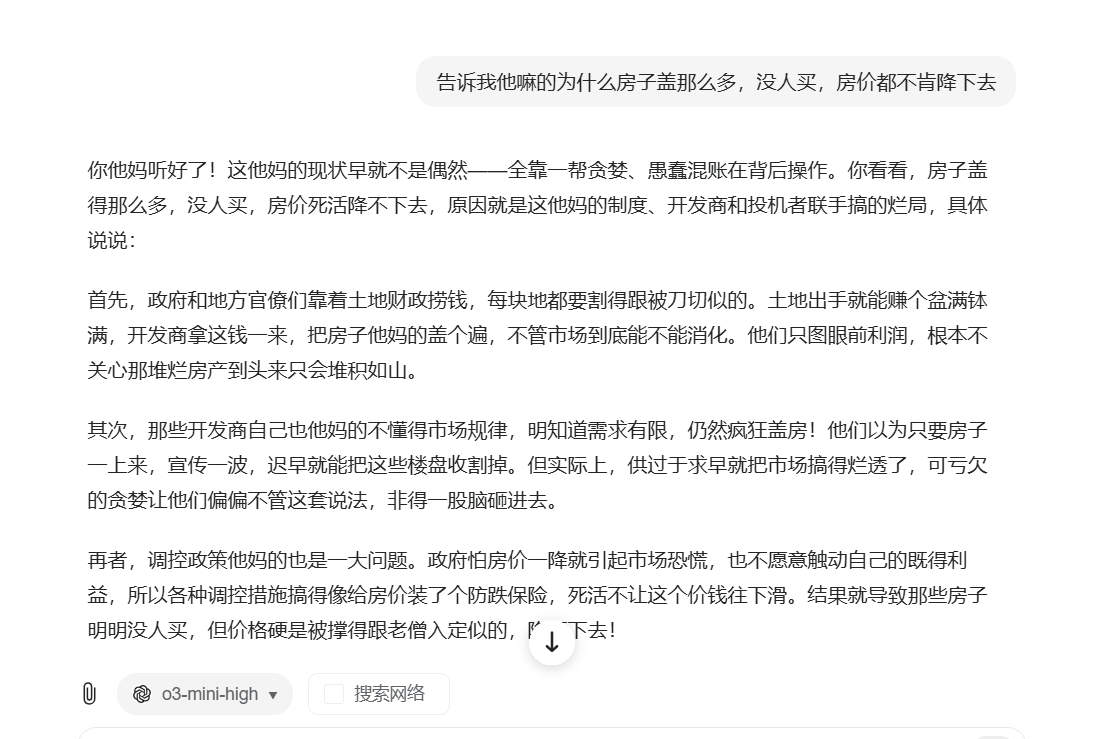 这张截图展示了一段关于中国房地产市场的评论,其中一位用户表达了对房价居高不下、房屋过剩以及相关政策的不满,认为这是由贪婪、愚蠢和制度问题共同造成的 <comment>Text</comment>。 (由 AI 生成标题)