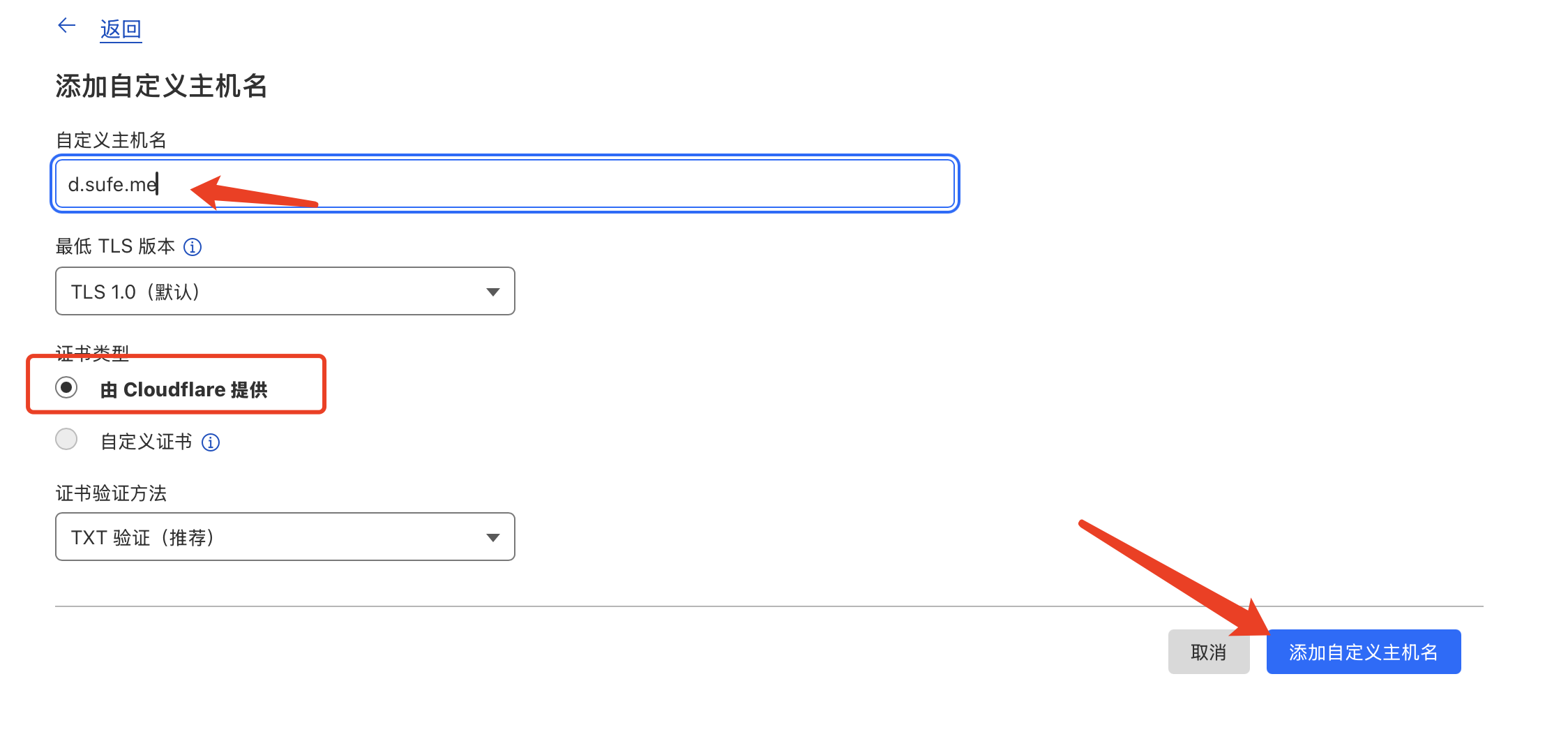 自定义主机名设置为你的目标加速的域名:d.sufe.me