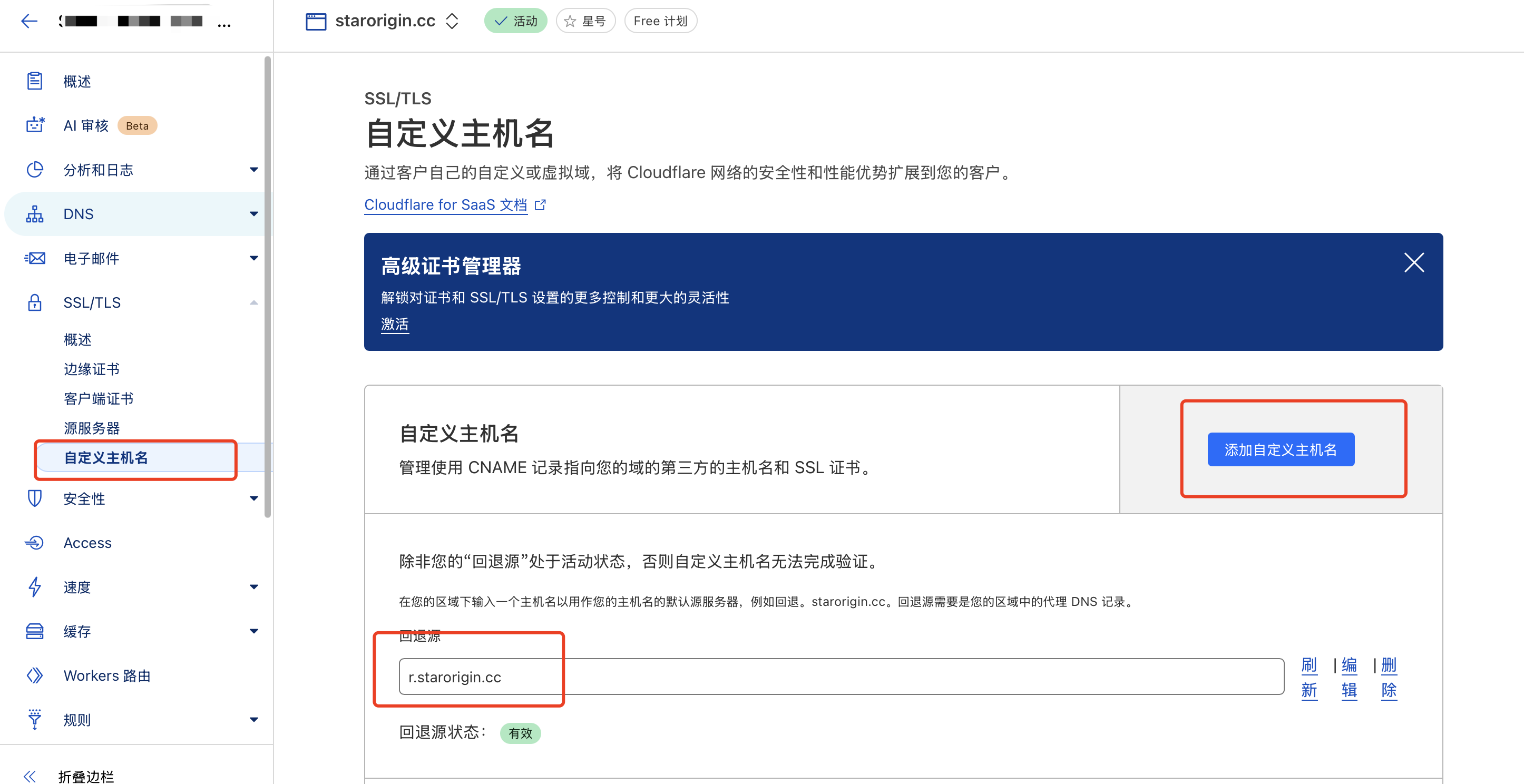 三、设置回源域名,添加自定义主机名
