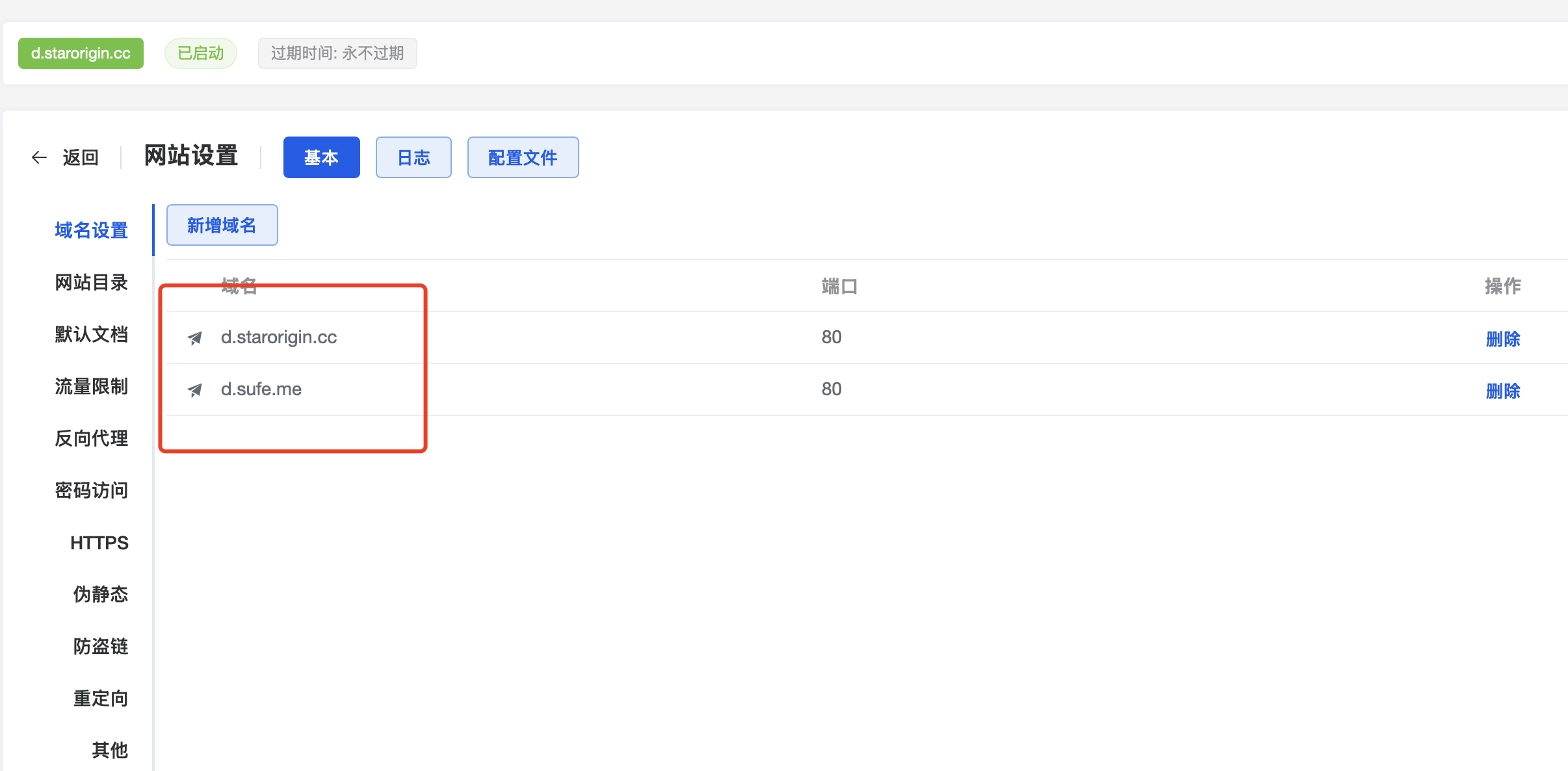 找到你的反向代理设置,域名中添加你的目标加速域名:d.sufe.me