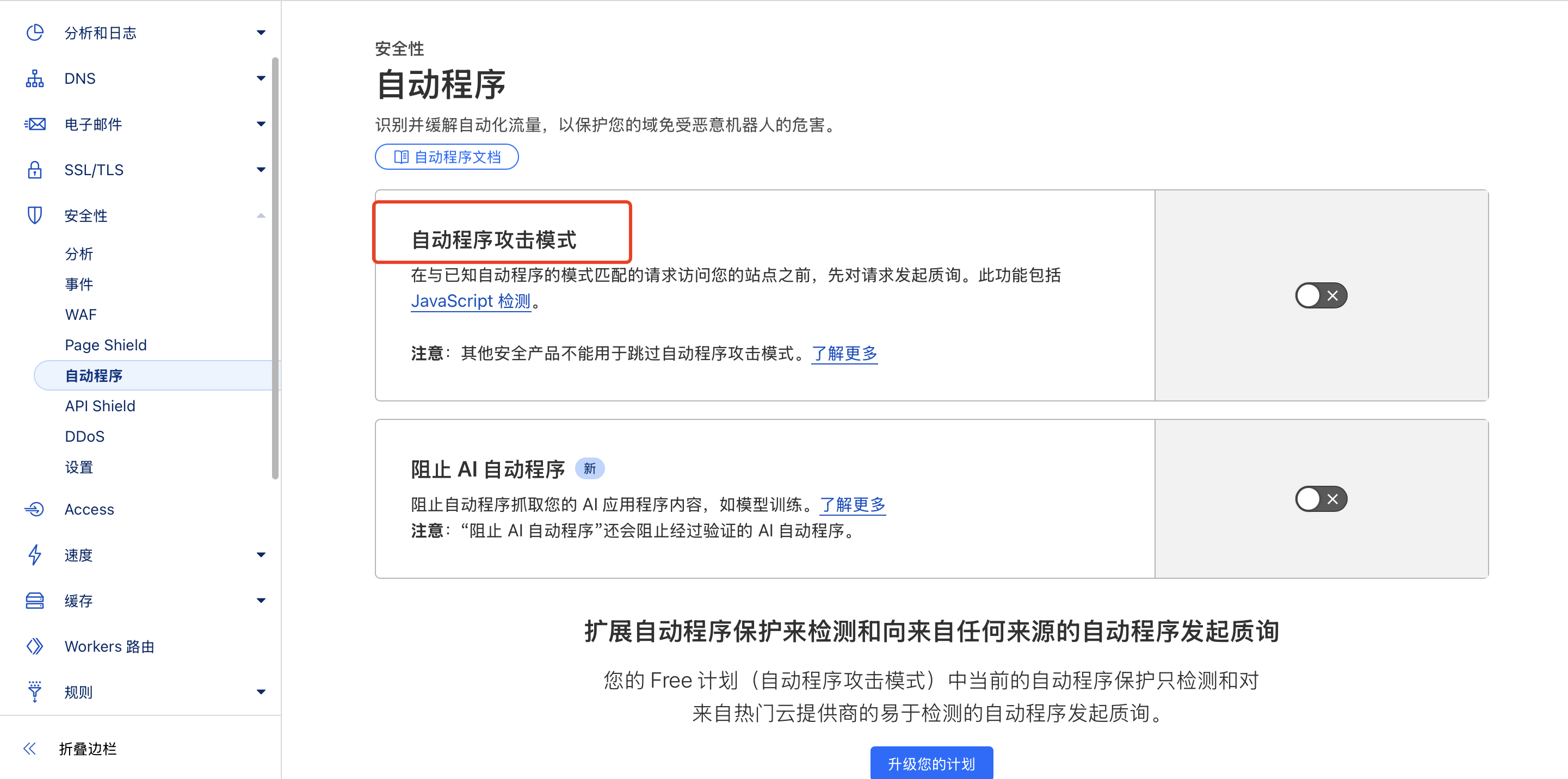如果哪吒探针连不上或者掉线,去看一下探针域名的自动程序攻击模式是否开启,开启之后cloudflare会自动屏蔽探针之间的流量