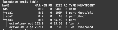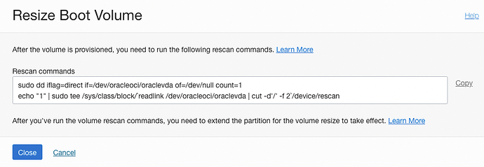 echo “1” | sudo tee /sys/class/block/`readlink /dev/oracleoci/oraclevda | cut -d’/’ -f 2`/device/rescan</em>